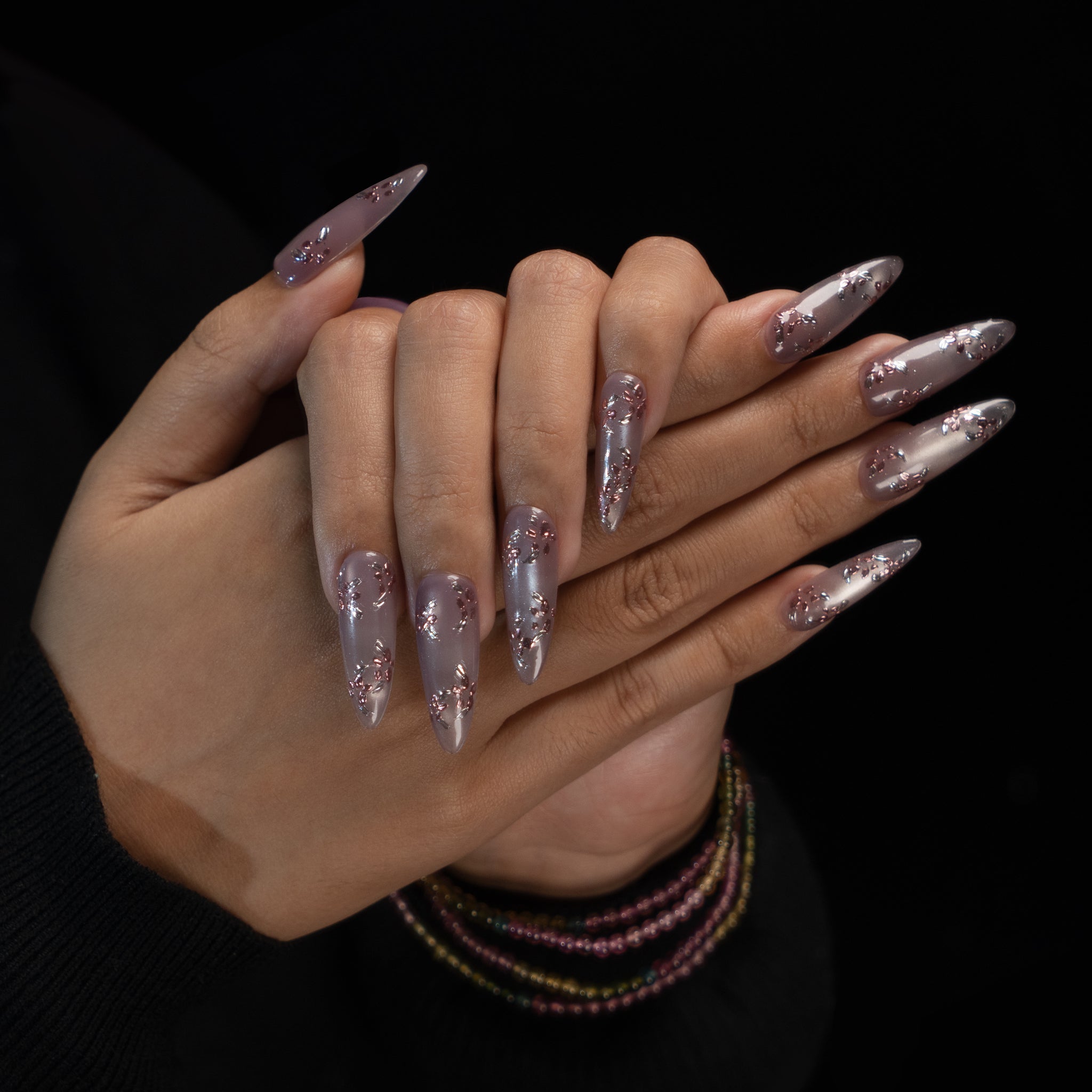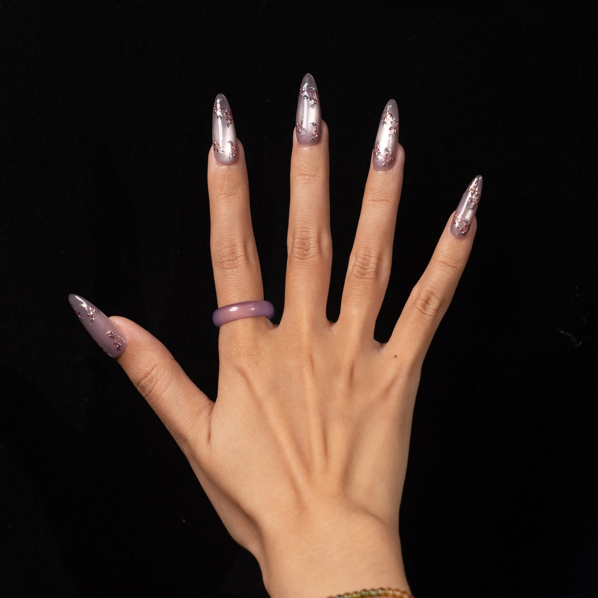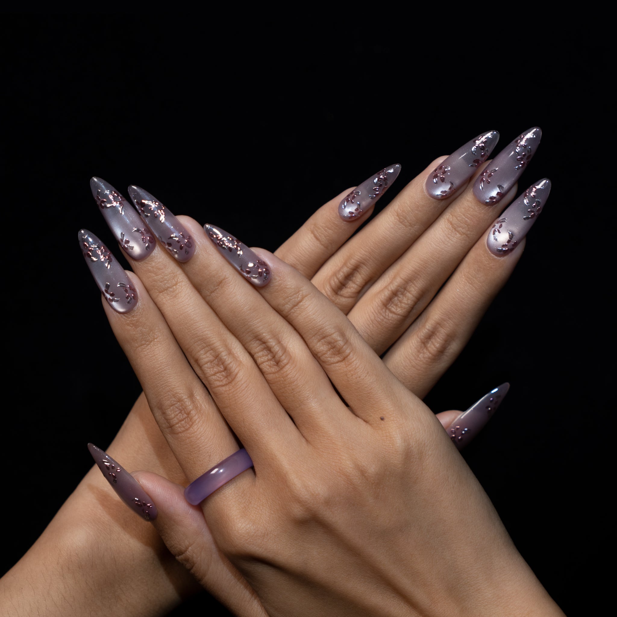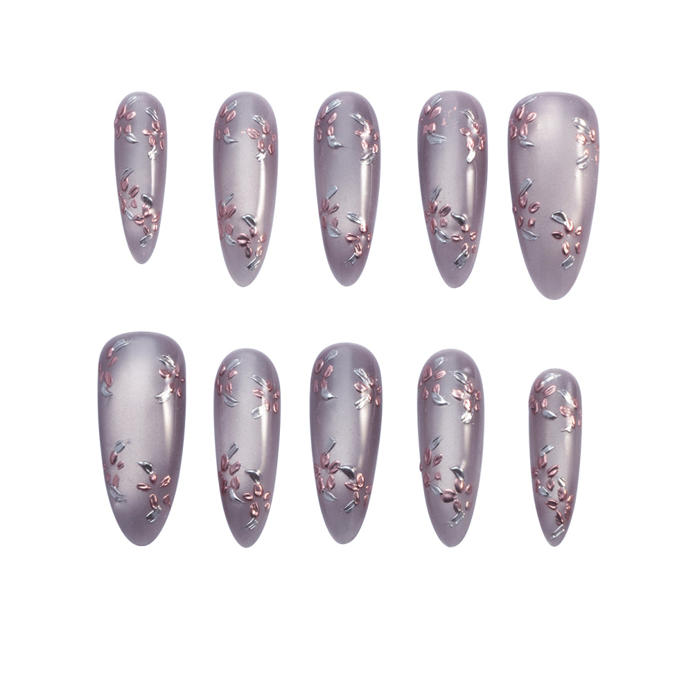 Sur un fond deffet œil-de-chat mauve clair, baigné dun éclat subtile et changeant. Des fleurs esquissées avec désinvolture viennent orner longle, créant un ensemble qui allie les nuances changeantes et magiques du chatoyant à la discrète élégance de la flore.