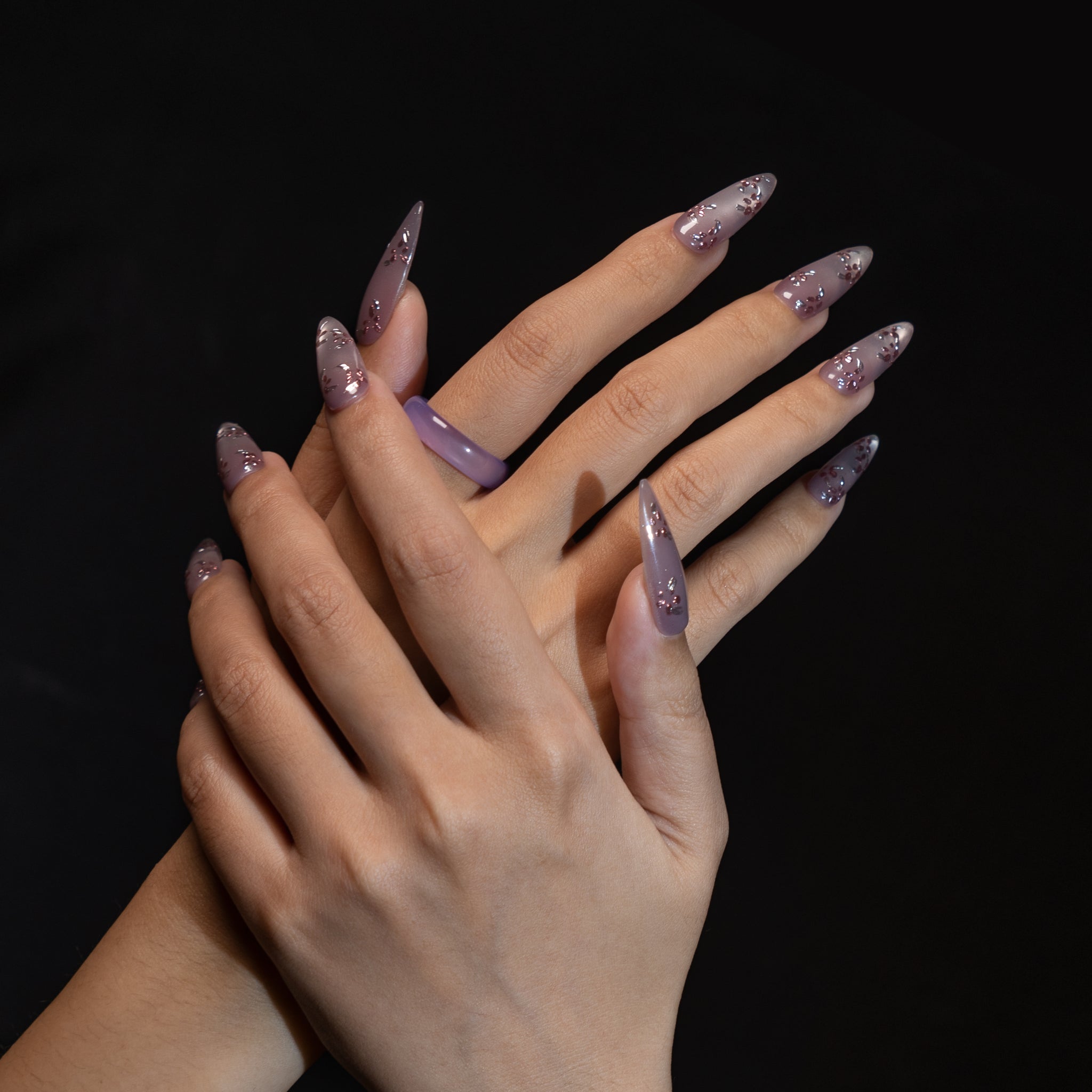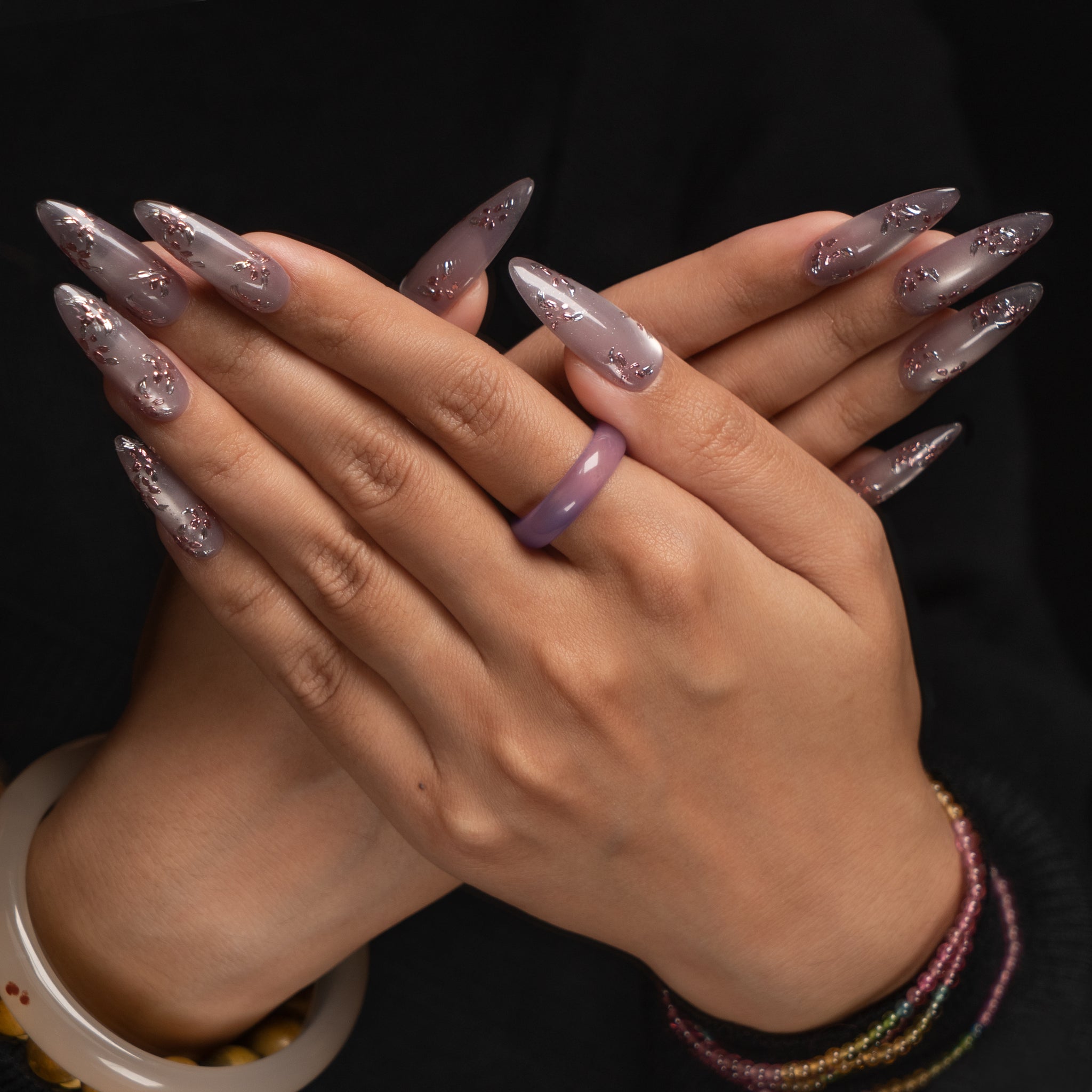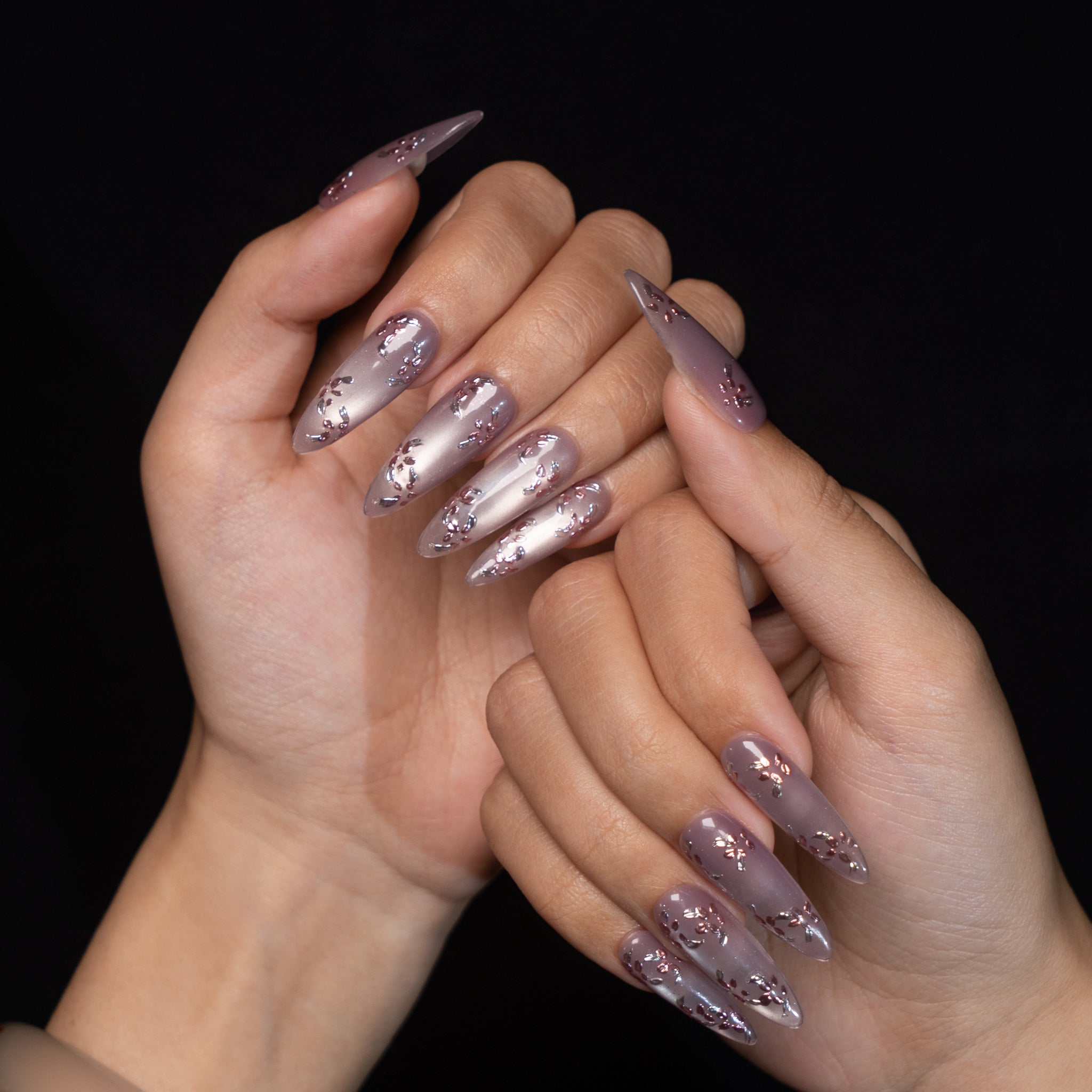 Sur un fond deffet œil-de-chat mauve clair, baigné dun éclat subtile et changeant. Des fleurs esquissées avec désinvolture viennent orner longle, créant un ensemble qui allie les nuances changeantes et magiques du chatoyant à la discrète élégance de la flore.