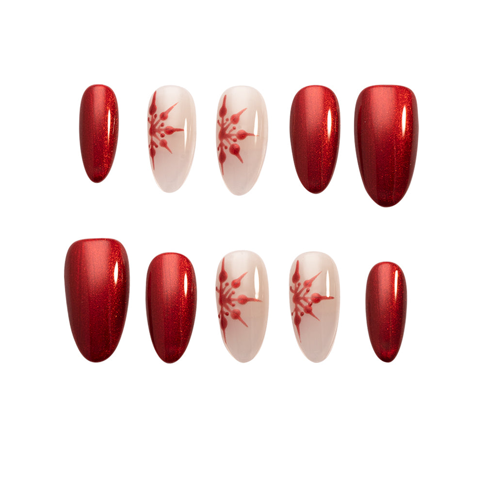 Sur une base de paillettes fines d’un rouge, évoquant la lueur chaude et diffuse des lumières de Noël. Sur l’ongle blanc, des flocons de neige rouges semblent incarner la ferveur d’un vœu, et cette fusion apporte toute la douceur réconfortante d’un hiver.
